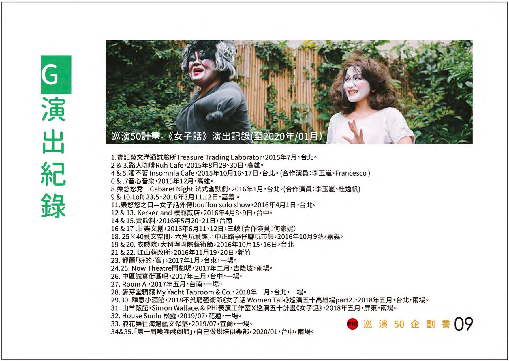 《女子話 Woman Talk》演出計畫,採取了西方當代小酒館夜總會表演的形式:1. 近距離的表演空間,2. 段落呈現的方式,使得每一段小戲都有機會在一次次搬演過程中,不斷接受觀眾的挑戰,成長或是變化。